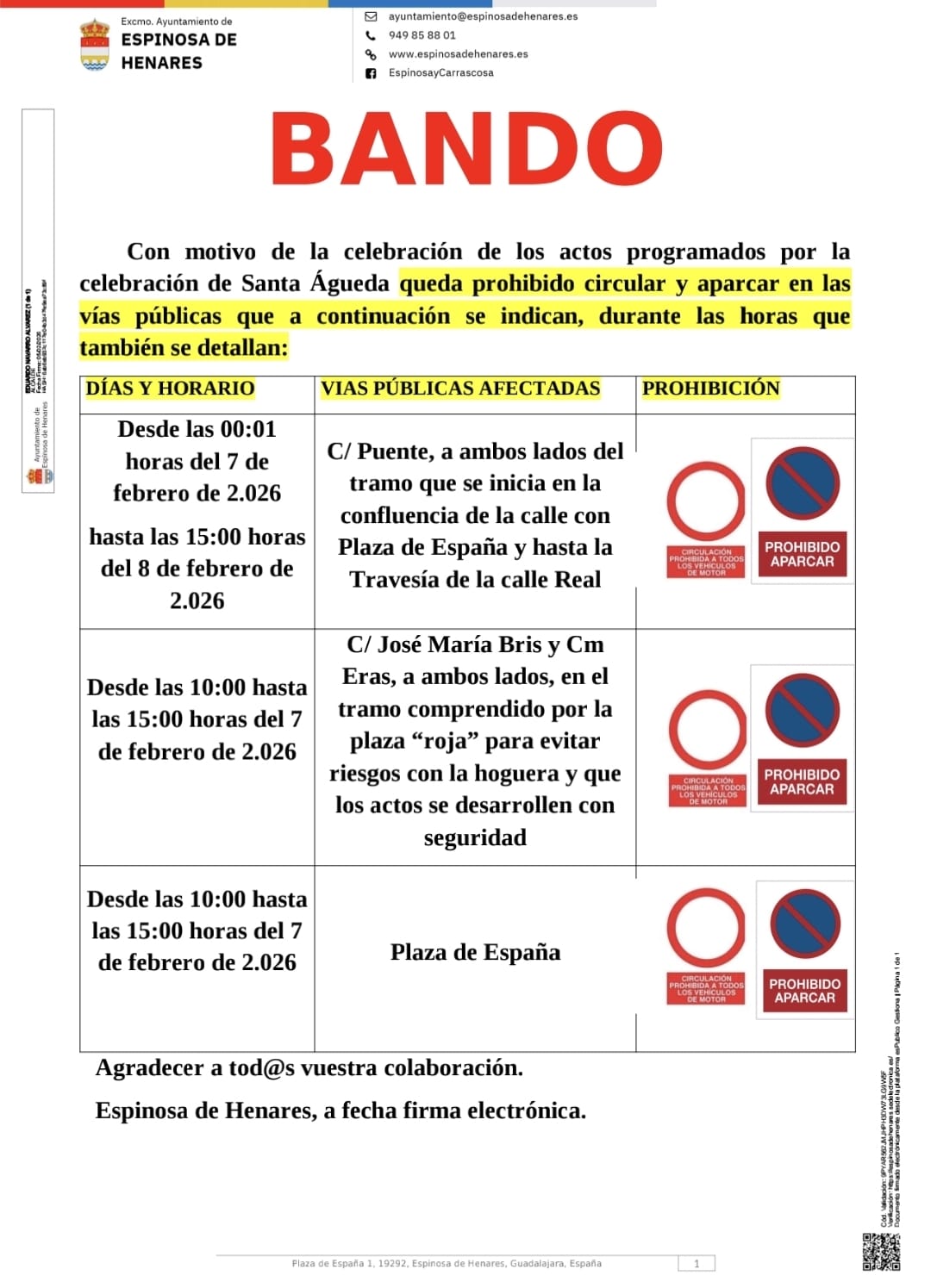 🎉 Con motivo de la celebración de los actos de Santa Águeda, se informa a todos los vecinos y vecinas que 🚫 queda prohibido circular y aparcar 🚗❌ en varias vías del municipio durante los días y horarios indicados ⏰👇