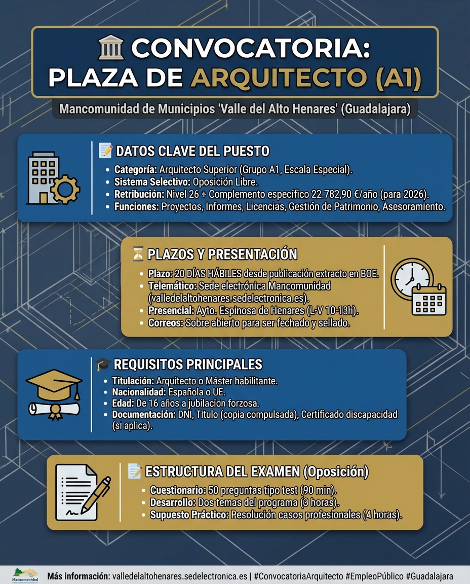 La Mancomunidad de Municipios del Valle del Alto Henares 🏛️, integrada por los municipios de Jadraque, Espinosa de Henares y Cogolludo, ha publicado la convocatoria para cubrir la plaza vacante de arquitecto/a funcionario/a 📐.