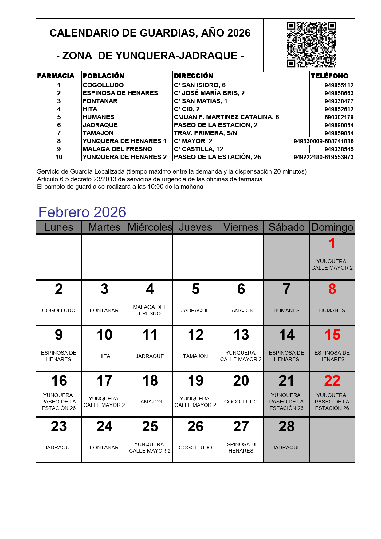 📆 En el mes de Febrero los días de parada en Espinosa serán: