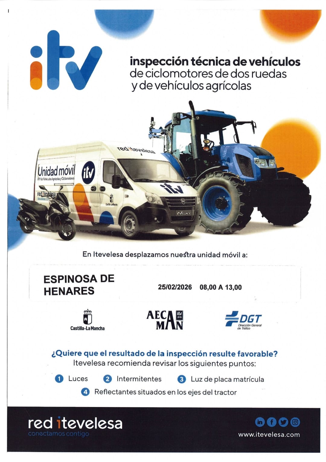 Habrá una unidad móvil de Inspección Técnica de Vehículos en nuestro municipio, para que pasen la ITV 🏍️🛵ciclomotores de dos ruedas y 🚜vehículos agrícolas.