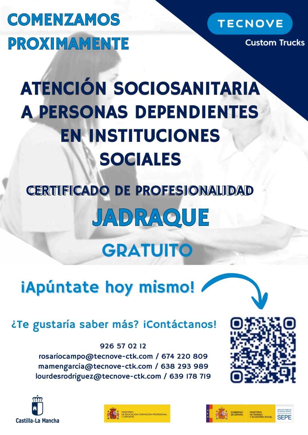 Desde el Ayuntamiento de Espinosa 🏛️ informamos del inicio próximo del Certificado de Profesionalidad en Atención Sociosanitaria a Personas Dependientes en Instituciones Sociales, que se impartirá en la localidad de Jadraque 📍.